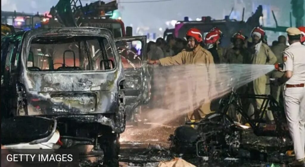 लाल किल्ल्या जवळील मेट्रो स्टेशन गेट नंबर एक समोर एका गाडीमध्ये स्फोट झाल्याची फोनवरून माहिती मिळाली असे अग्निशामक दलाच्या अधिकाऱ्यांनी सांगितले